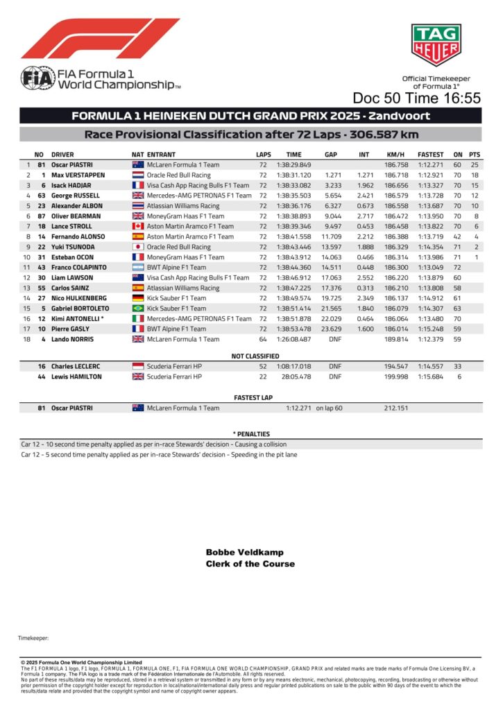 Abandono por pérdida de aceite para Lando Norris. Con la victoria de Piastri la diferencia se estira a 34 pts entre ambos Mc Laren que volvieron a no tener rivales.